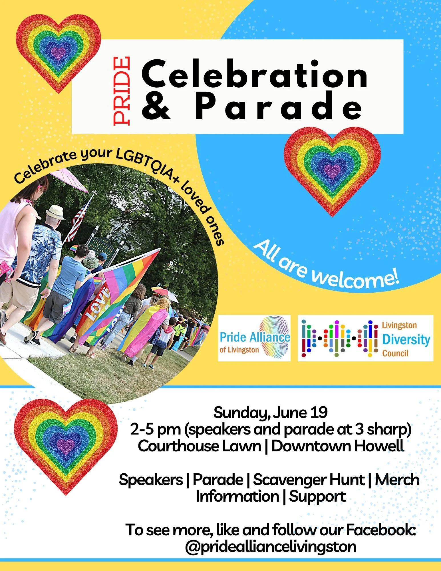 Pride Celebration Sunday, June 19, 2022 2:00 PM 5:00 PM 14:00 17:00 Google Calendar ICS Celebrate Pride at the Courthouse in Howell.There will be speakers, a parade, merchandise, information & support!
