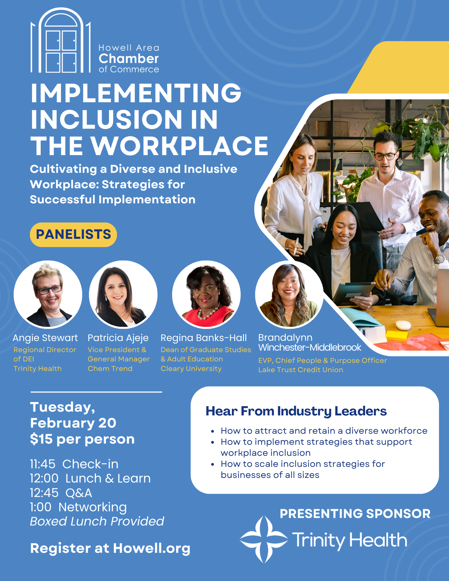 In partnership with the Howell Chamber of Commerce, we invite you to join us for this inspiring panel discussion featuring local leaders who have made inclusion in the workplace and inclusive leadership a daily action.