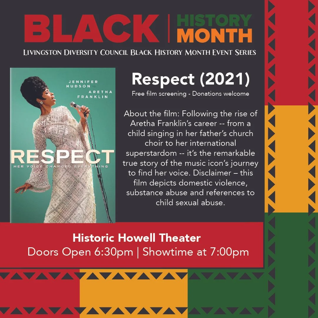Join us as we kick off our 2024 Black History Month series with a FREE film screening of "Respect" (2021) starring Jennifer Hudson in her incredible role as Aretha Franklin at the Historic Howell Theater. Donations are welcome.