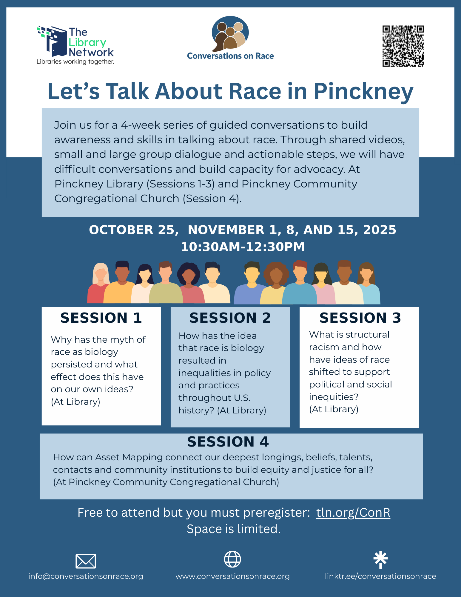 Join us for a 4-week series of guided conversations to build awareness and skills in talking about race. Through shared videos, small and large group dialogue and actionable steps, we will have difficult conversations and build capacity for advocacy.